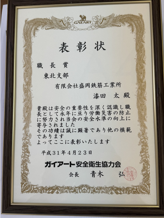 平成31年4月23日 ガイアート安全衛生協力会 表彰状